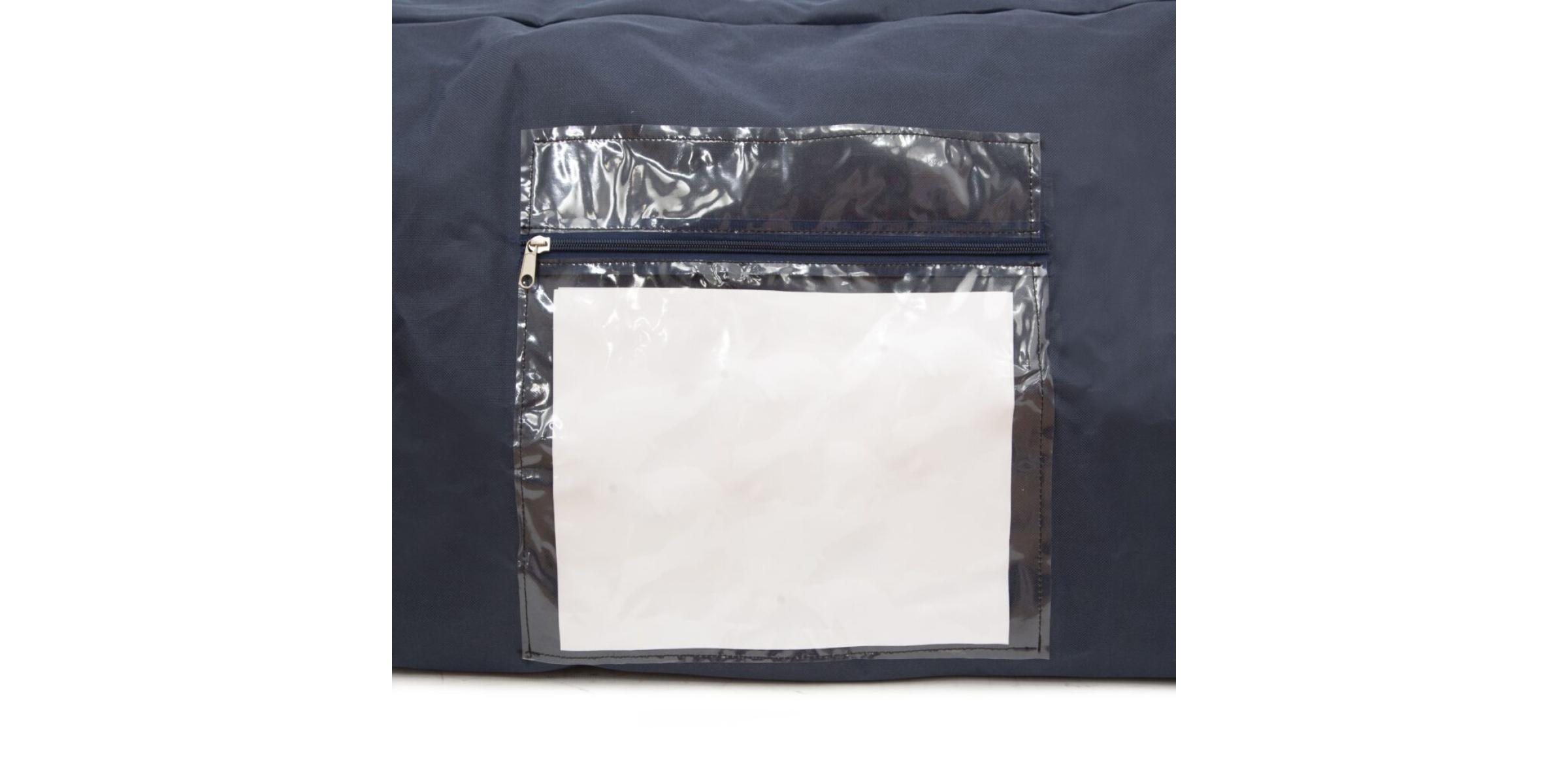 - Caractéristiques : Housse de transfert noire en nylon ou bleu marine, renforcée, avec 4 poignées et poche zippée pour la documentation.
