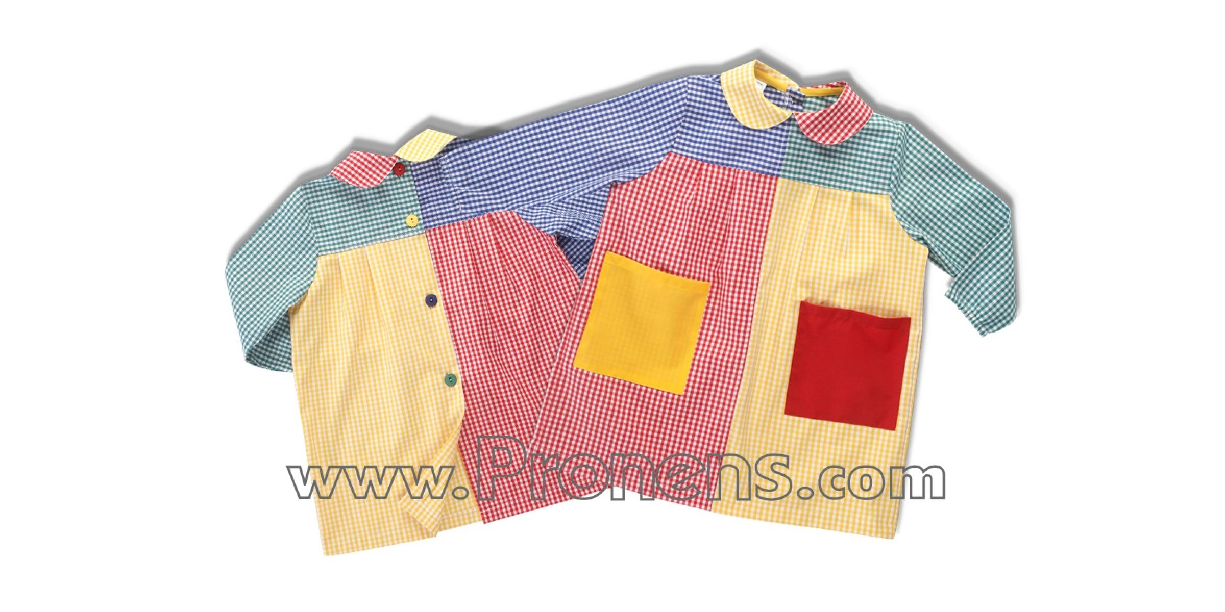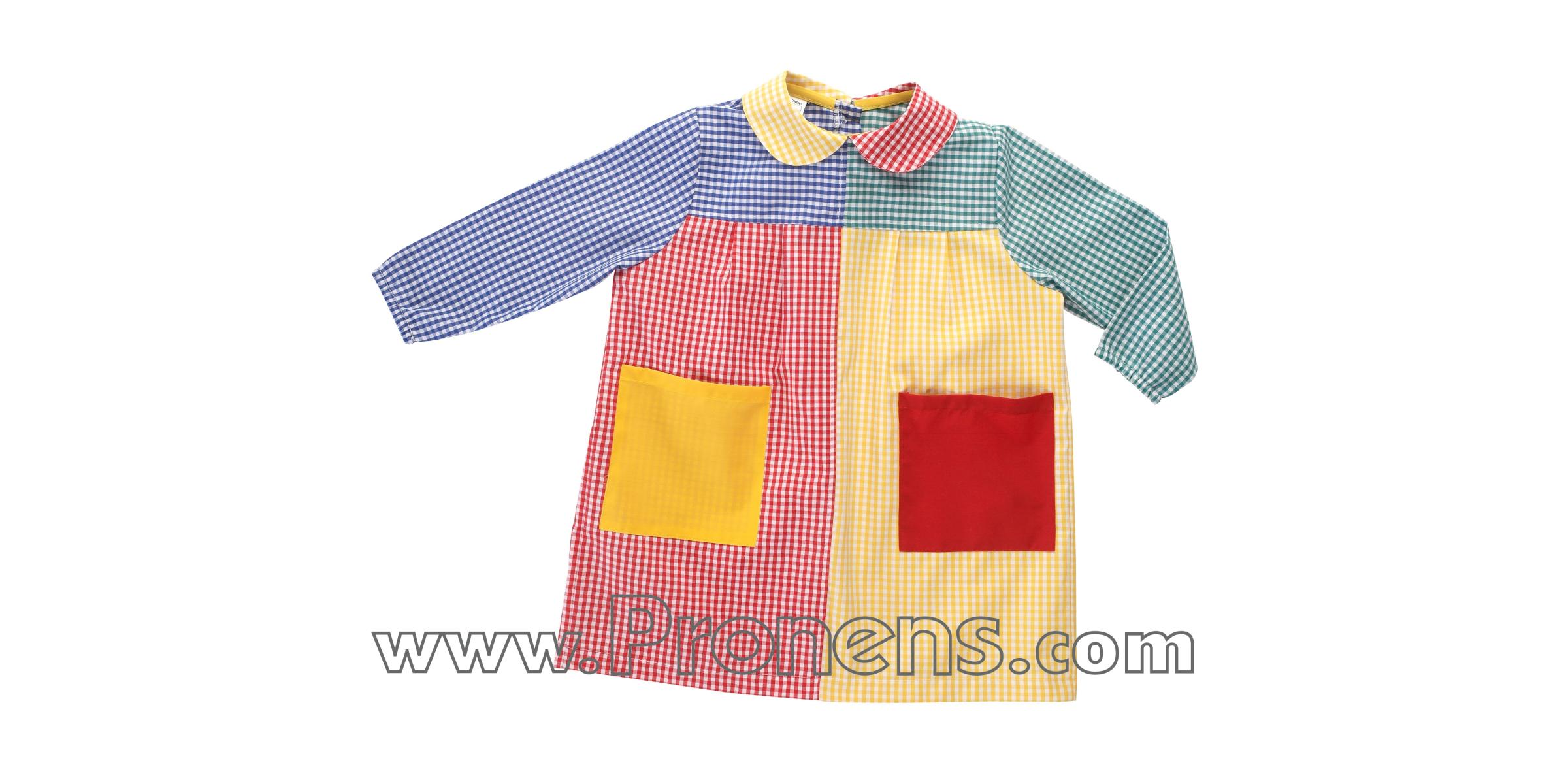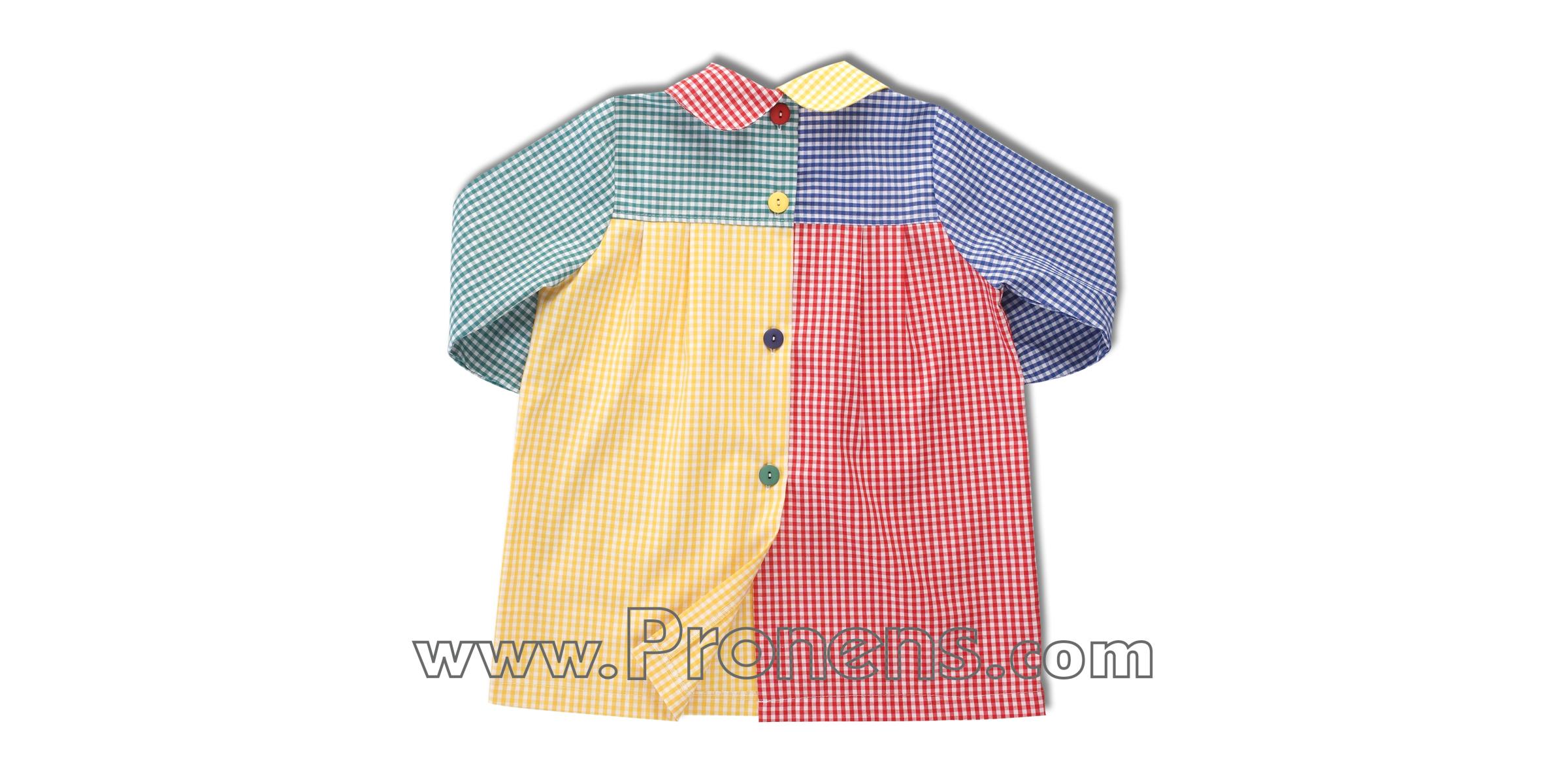 En PRONENS, fabricamos batas escolares con botones personalizadas, combinando calidad, comodidad y diseño para escuelas infantiles y guarderías. Nuestro Modelo Babi Botones Patchwork destaca por su diseño colorido y original, perfecto para aportar alegría y personalidad a los uniformes escolares de las escuelas infantiles.